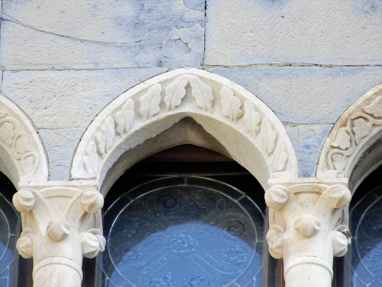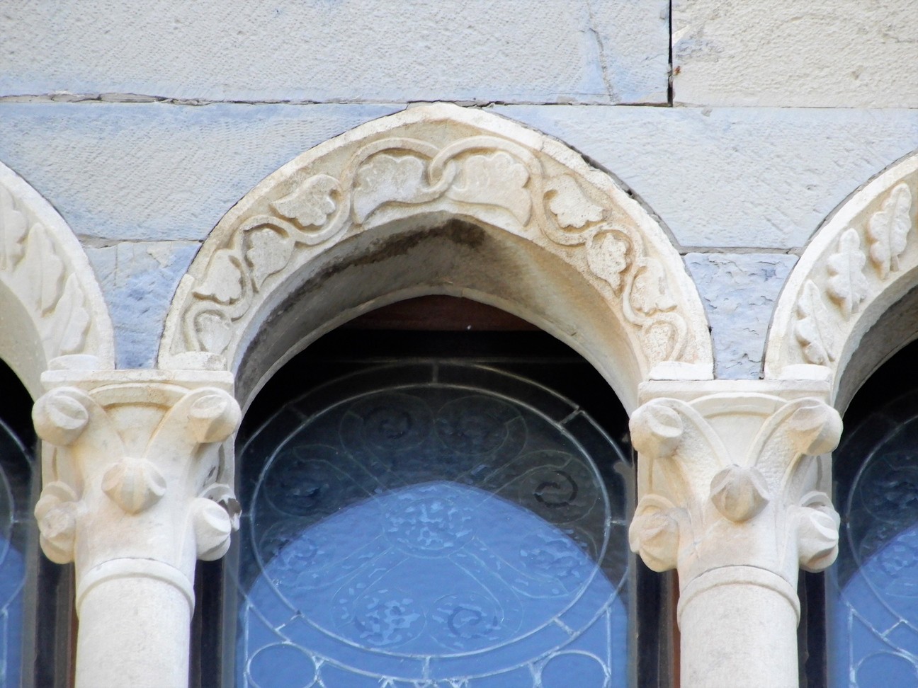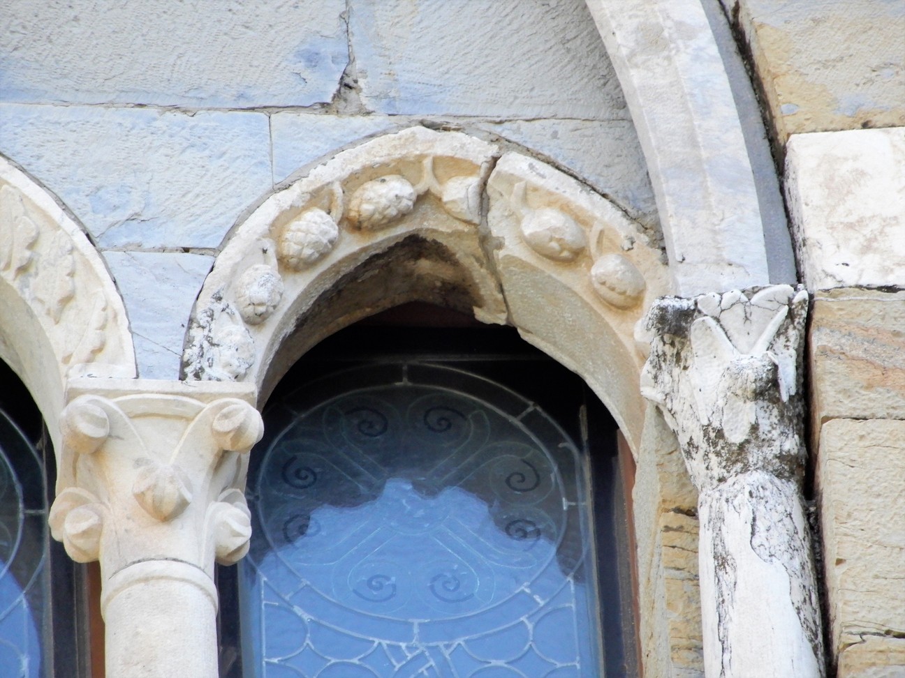L'apertura di sinistra è bifora con colonnine, cordonatura ottagonale di contorno ed archetti interni monolitici in marmo, decorati l'uno con tralci e l'altro con foglie.