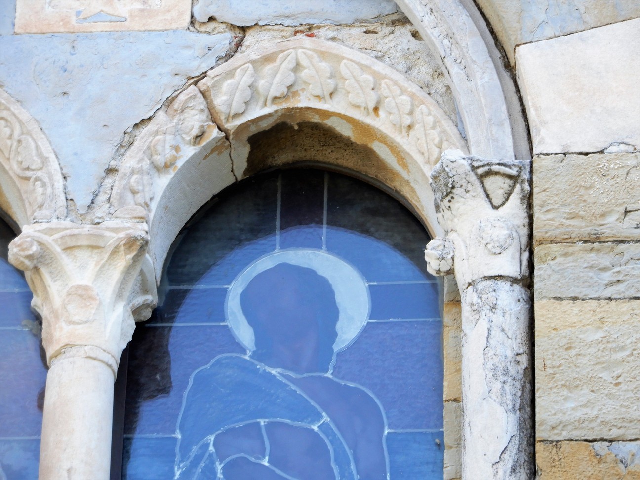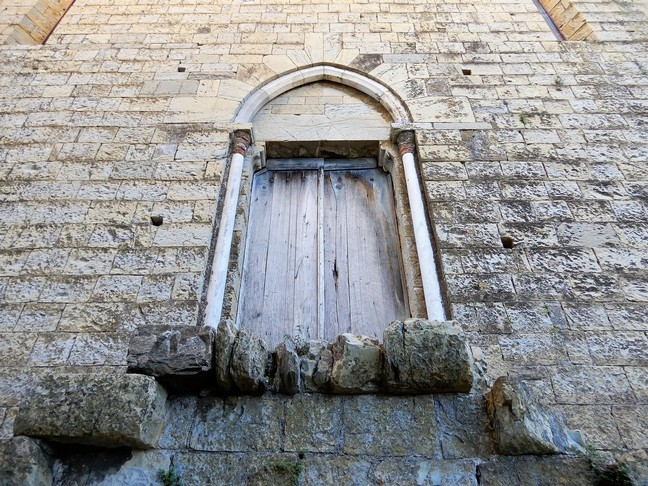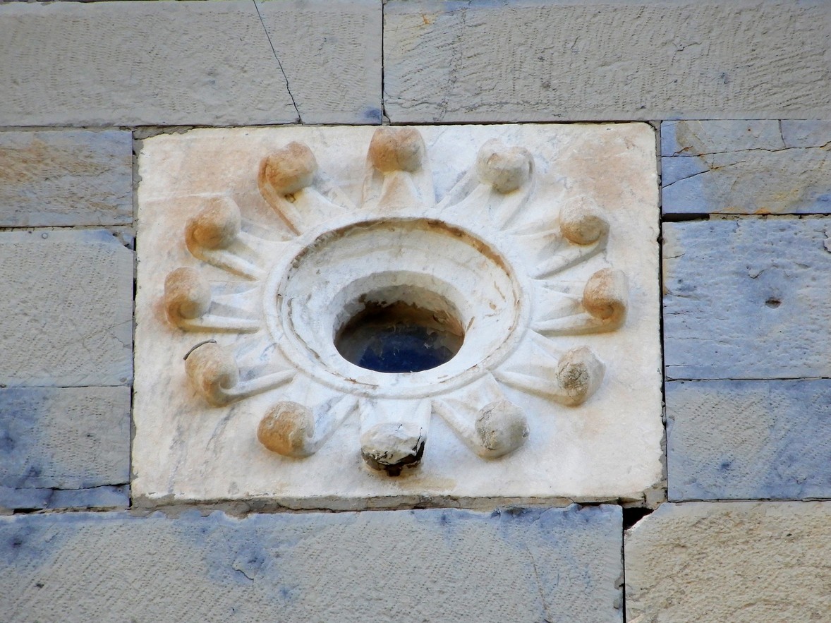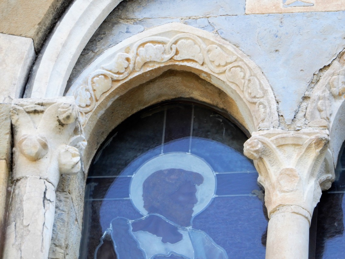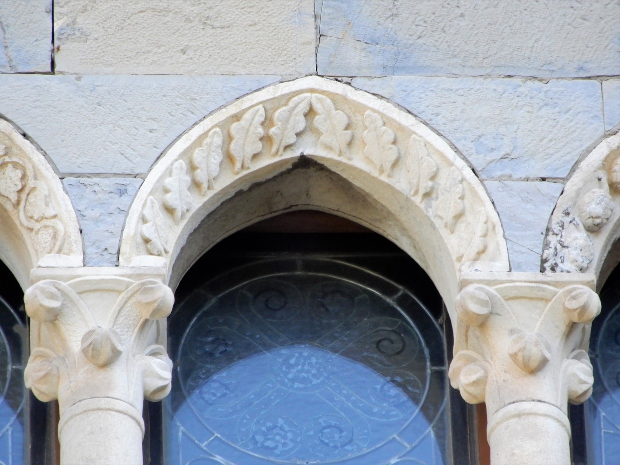 L'apertura di sinistra è bifora con colonnine, cordonatura ottagonale di contorno ed archetti interni monolitici in marmo, decorati l'uno con tralci e l'altro con foglie.